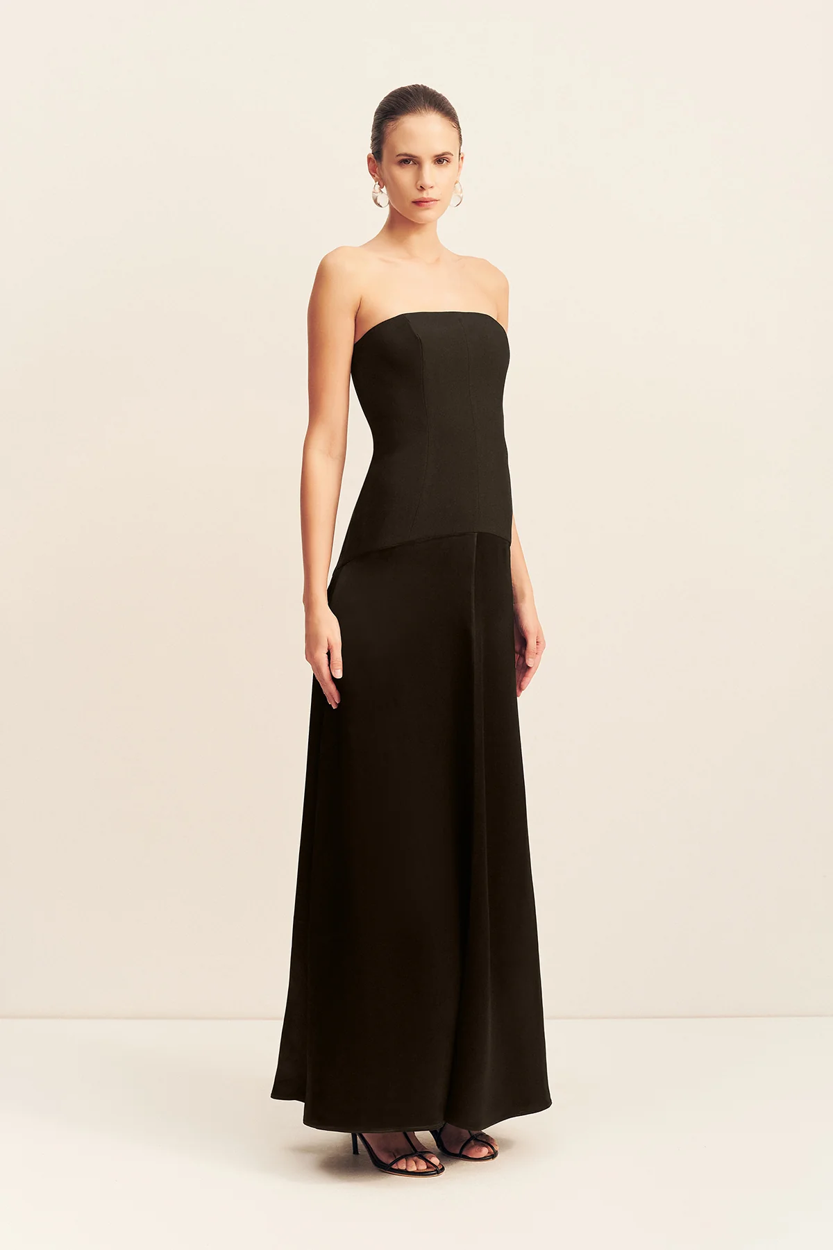 Strapless panelled maxi dress in black in a traditional suiting contrasted with a luxurious satin acetate.