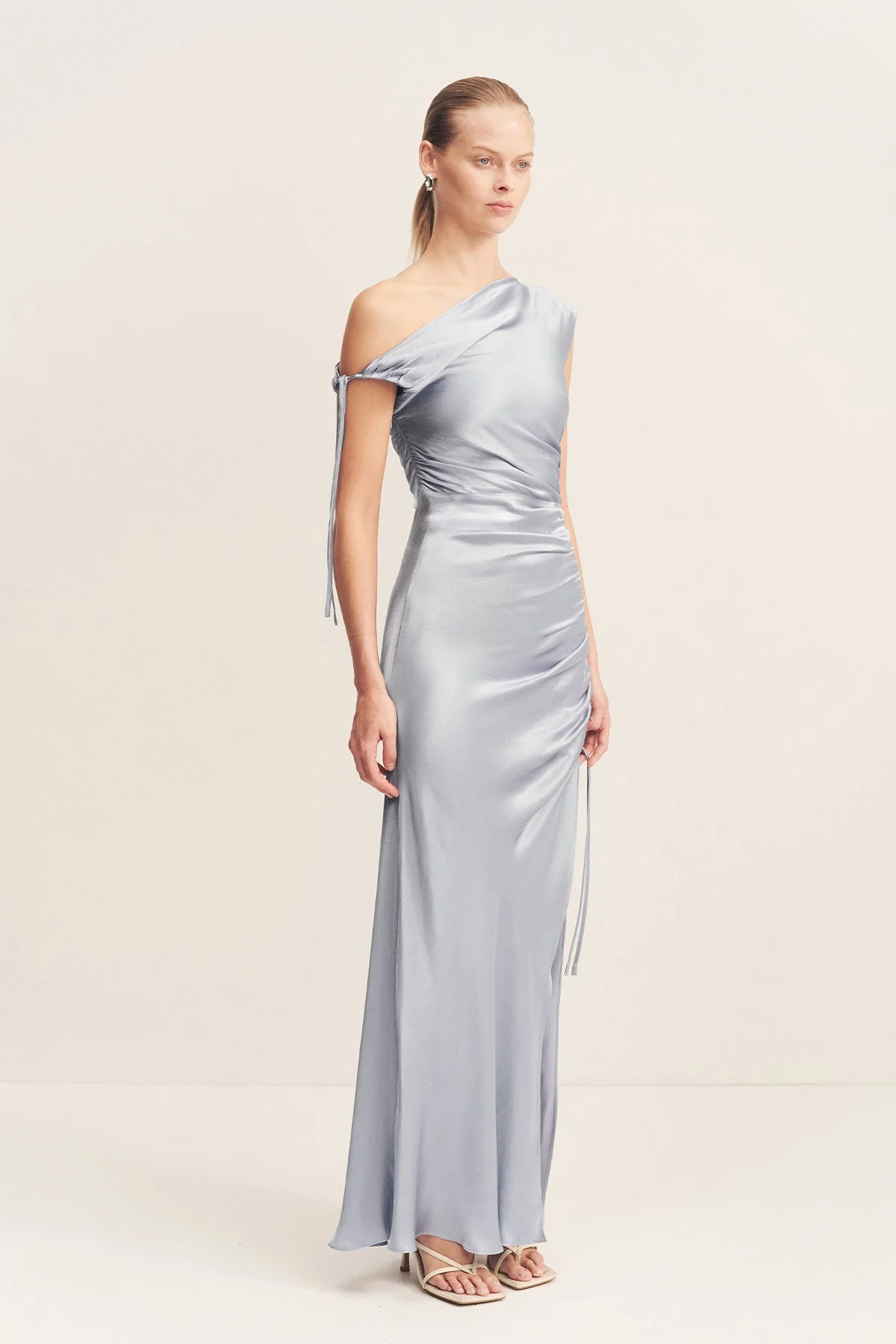 Gathered maxi dress in powder blue in a LENZINGâ„¢ ECOVEROâ„¢ with luxurious satin finish.