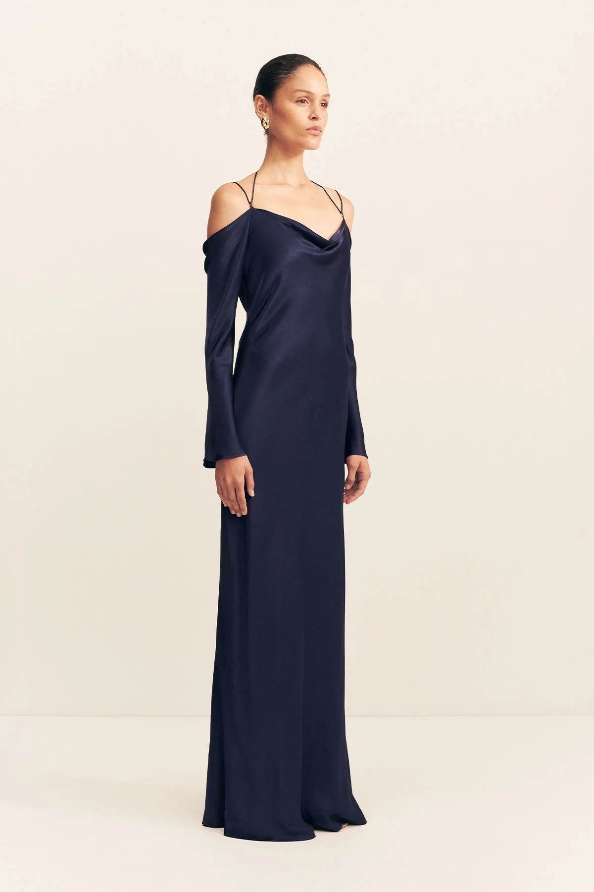 Off shoulder maxi dress with tie details in midnight in a LENZING ECOVERO with a luxurious satin finish.