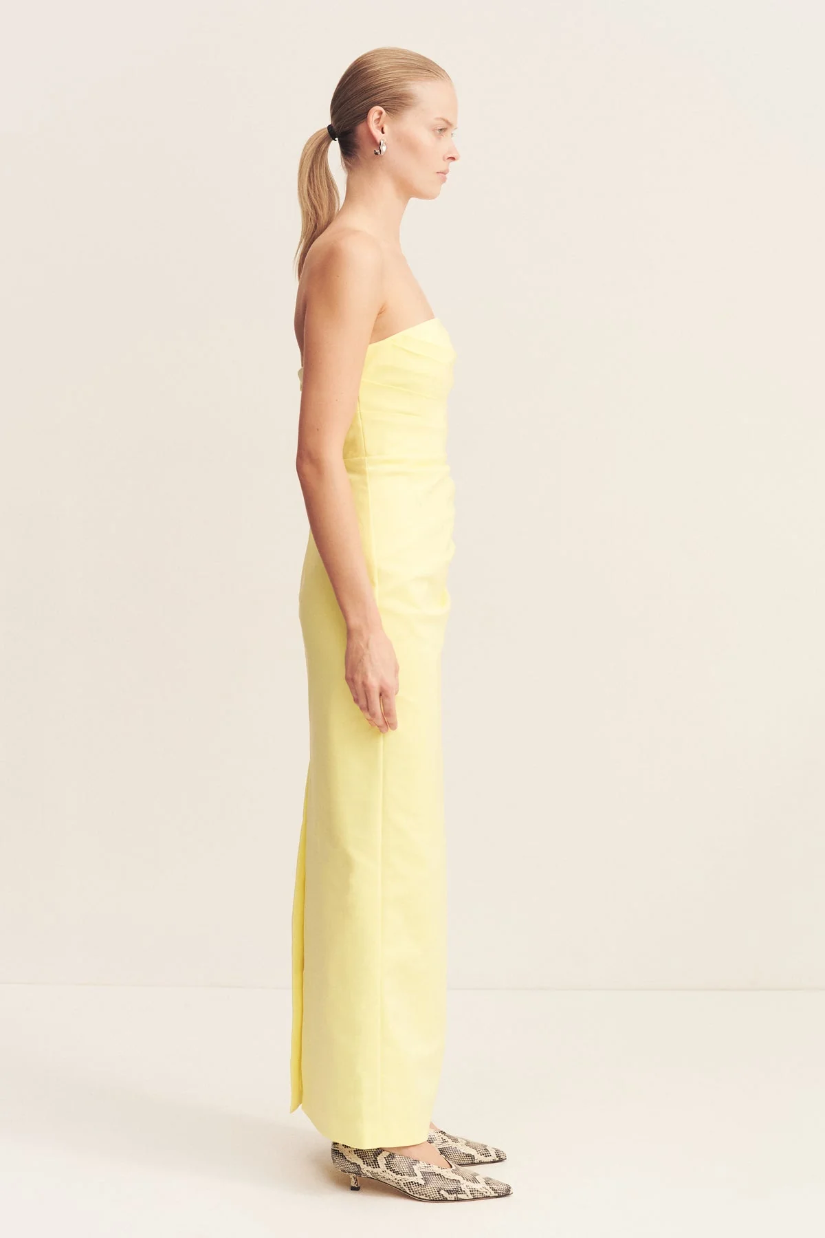 Strapless draped maxi dress in a premium stretch cotton blend in lemonade.