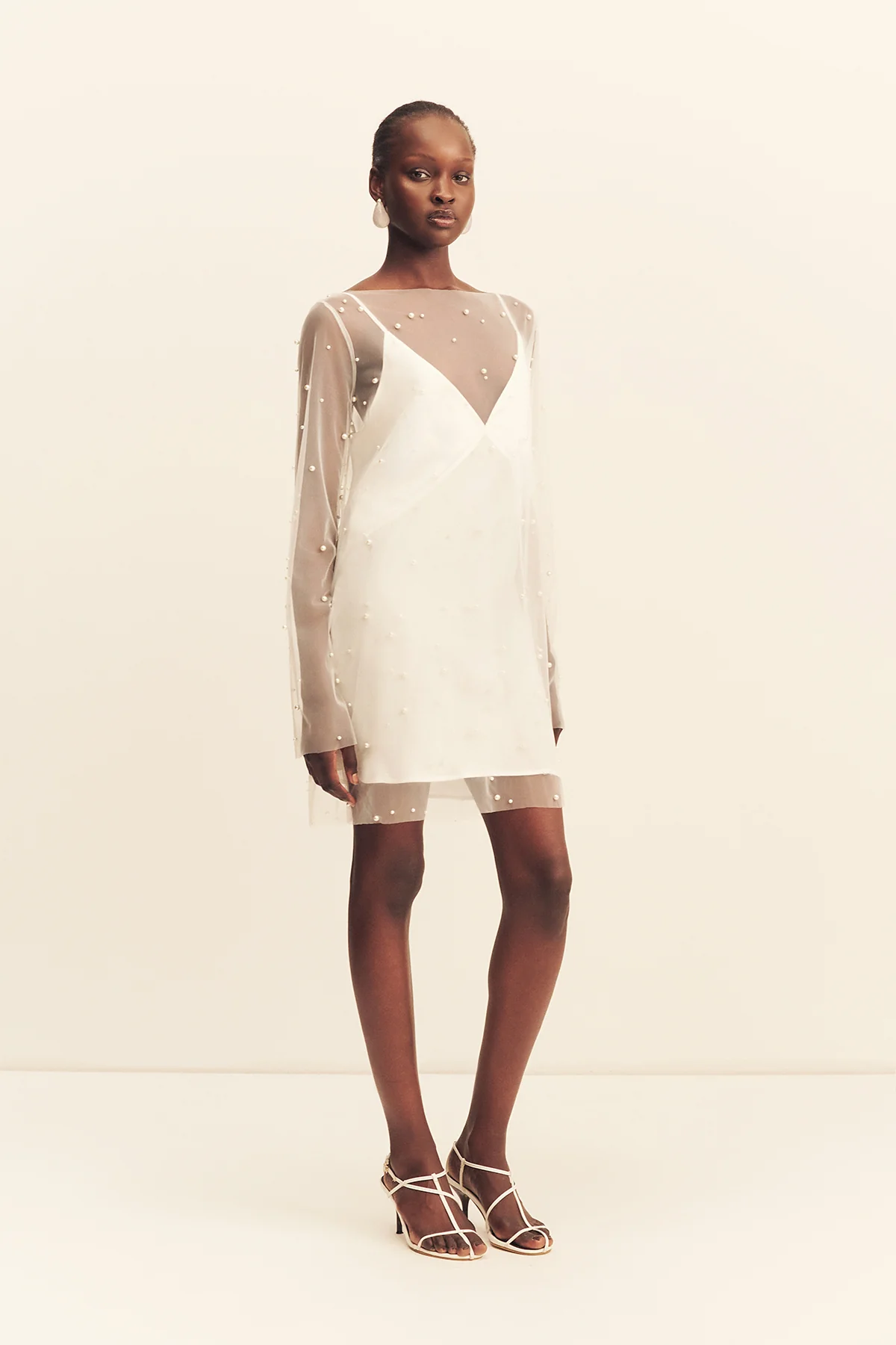 Long sleeve mini dress in ivory in a sheer pearl beaded mesh.